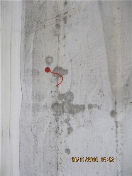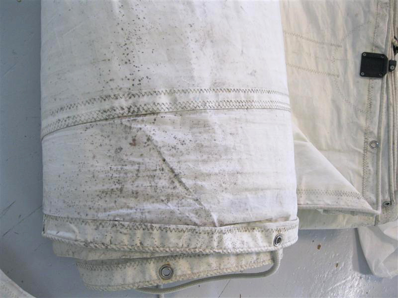 This main was stored for the winter next to some damp lines, when it was pulled out in the Spring, more than half was covered with black mildew spots. Luckily, we were able to quickly clean and return it so the customer did not miss that first sail of the season.