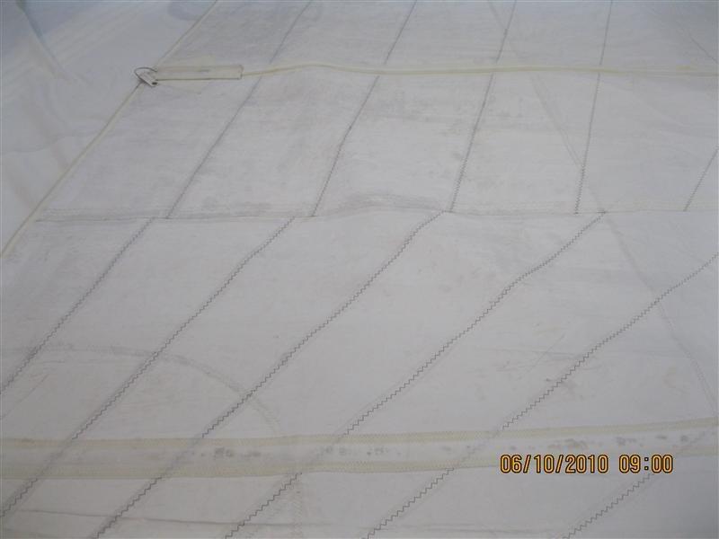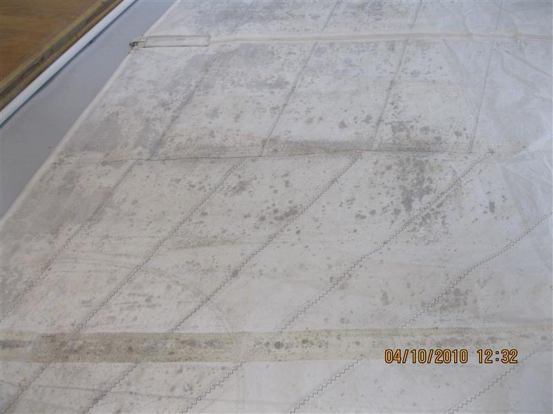 On this radial cut sail, mildew started in the seams and grew from there, spreading like wild fire. The fibers in the cloth actually promoted this by “wicking” moisture throughout the sail.